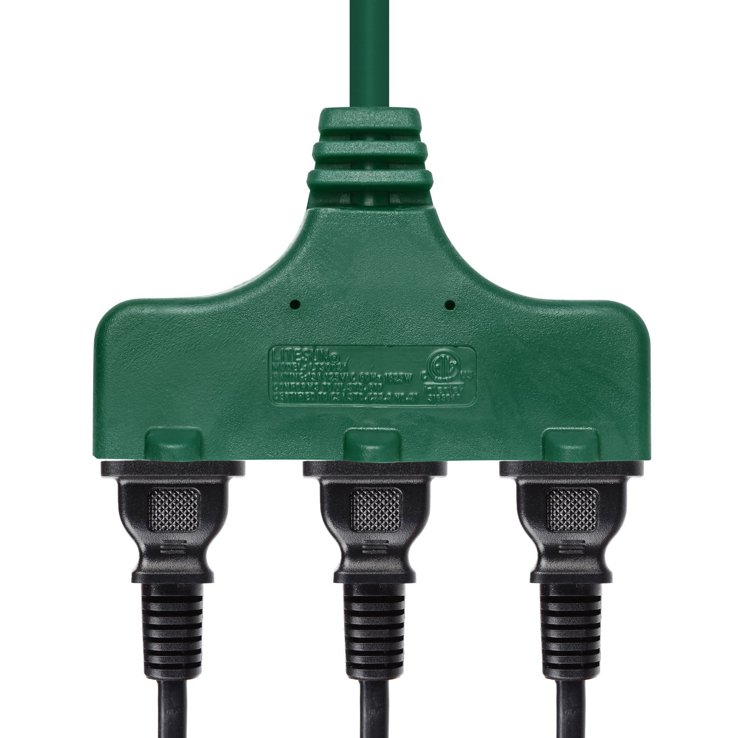Splitter Extension Cord Plus 6 ft.), expands 1 wall outlet into 3 extended outlets (up to 28 ft. Pvc jacket protects against moisture, and direct sunlight;. 1 to 4 splitter extension cord, max 33.3 ft end to end (43 ft total), 3 prong plug with 4 extended outlets, 16awg/3c sjtw extension cord. 1 to 3 way outlet indoor & outdoor use weatherproof sjtw. Splitter Extension Cord.
